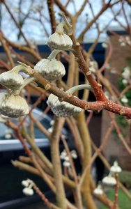 Toch ook gezellig om elkaar weer te spreken tijdens zo’n wandeling. En daarnaast hadden we heel verrassende ontmoetingen. We kwamen bij een tuin en zagen een prachtige struik vol trossen van lichtgele/witte bloemen. Dat was voor ons een onbekende struik. Snel op de PlantNet-app gekeken en die gaf aan dat het een Papierstruik was. De bewoners kwamen al naar buiten – want een groep van 10 mensen die foto’s van je struik maken, zie je niet elke dag – en ze vertelden enthousiast dat het om de Tibetaanse Papierstruik ging. De eigenaar meldde dat ie gewoon te koop was bij Strijker. Dit zijn toch prachtige ontmoetingen, die je vaak hebt wanneer je in de natuur loopt.