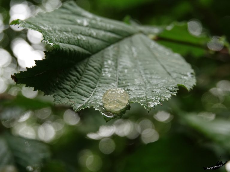 Gisteravond in boswachterij Ruinen viel mijn oog, op ooghoogte, op een vijftal glibberige klonten ‘spul’ direct naast een bospad op verschillende uiteinden van bladeren.