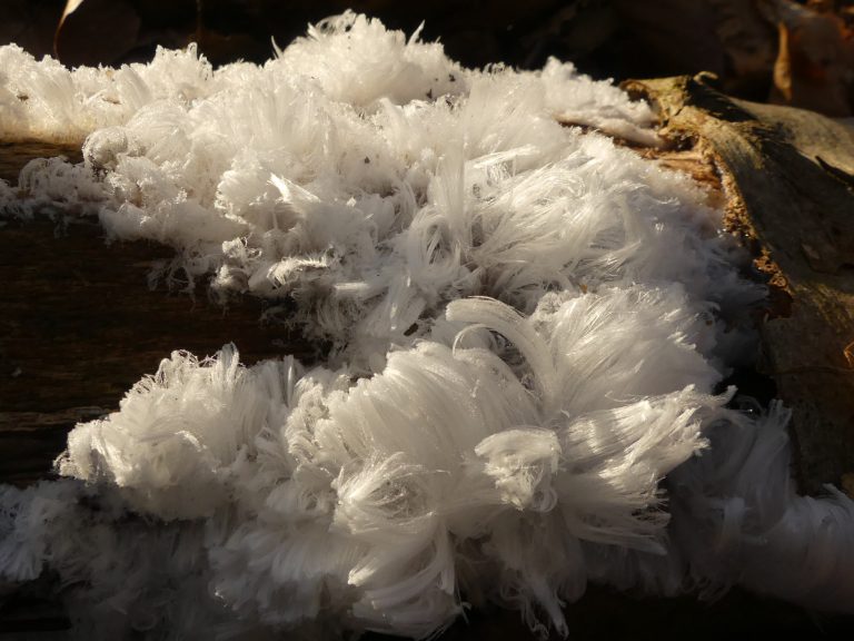 Vanmorgen bij Lhee: ijshaar. Je ziet een stokje om 9 uur met ijshaar en om 11 uur alle ijshaar verdwenen. En ijshaar op een stam.