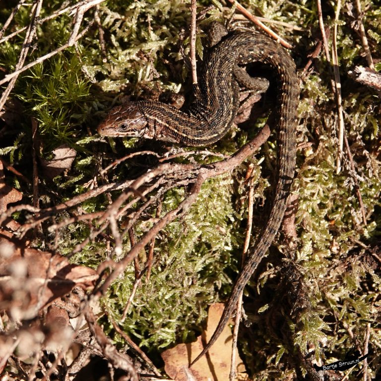Het is nog maar 8 graden en er staat een stevig en koude oostenwind, de zon schijnt echter al een paar uur volop. Een beetje in de windluwte van een oude boomstronk, zie ik opeens een levendbarende hagedis zonnebaden.
