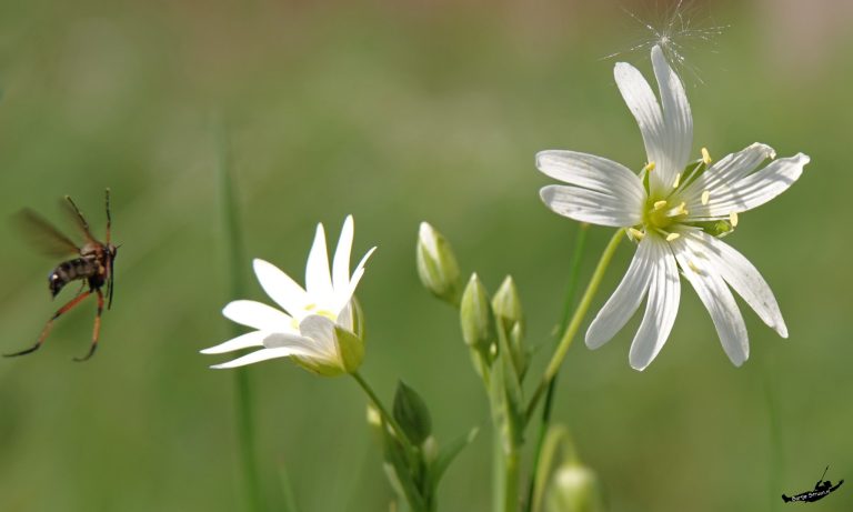 Als je dan toch buiten bent en ‘met je hoofd leeg, klein gaat kijken’, zie je ongetwijfeld nog veel meer kleine beestjes zoals de onweerstaanbare slijkvlieg, de elzenhaantjes of die rare vlieg met zijn ontzettend lange achterpoten; dit is één van de 200 soorten dansvliegen die in Nederland voorkomen.