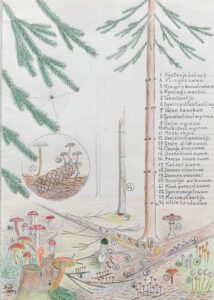 Bernhard de Vries, mentor van de paddenstoelenwerkgroep van IVN Hoogeveen, heeft in het verleden talloze prachtige pentekeningen gemaakt, waaronder deze van het fijnsparrenbos. Wat een rijkdom is hier te vinden.
