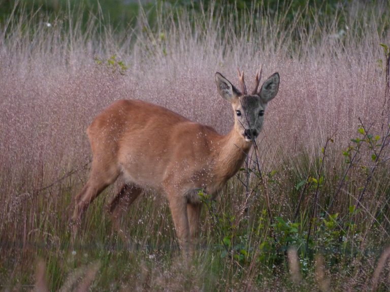 In de wintermaanden leven reeën in sprongen. Een sprong van vijf wordt in Drenthe het meest gezien. Deze sprong bestaat uit een leidende reegeit, twee kalveren van dit jaar, een smalree of jonge bok en een oudere bok. Reebokken hoeven nu niet meer een territorium te verdedigen. Ze werpen hun gewei af. Beenvretende cellen bij de kop maken de geweistangen poreus. Ze worden daar bros. De bok tikt tegen een tak aan en de geweistang breekt af. Dat gaat gepaard met een beetje bloed. Na enkele dagen is de bloedplek bedekt met een nieuwe huid. Hierin groeit een nieuw gewei. De tweede geweistang volgt een paar dagen later. Je vindt altijd slechts één geweistang. Van de dode reebok op de foto heb ik beide geweistangen afgehaald. Dan heb je een doublet. Zesenders werpen hun gewei begin december af, gaffelbokken volgen eind december en spiesbokjes kunnen in januari nog met hun nietig spiesgeweitje rondlopen. Uiteindelijk krijgt iedere ree een nieuw gewei vanaf februari. En weer eerst de zesenders, dan de gaffelbokken en daarna de spiesbokjes.
