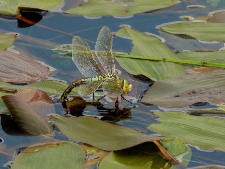 Het is zomer, juli. De grote libellen sluipen uit. Als eerste de grote keizerlibel, met een lijflengte van 8 en een spanwijdte van 10 centimeter de grootste libel van ons land. Kijk in de Oude Kene of boven de vijvers in het Steenbergerpark. Daar patrouilleert de keizer, Anax imperator, in zijn keizerrijk. Fel verdedigt hij zijn territorium tegen indringers en zorgt goed voor zijn vrouwtje. Het mannetje is hemelsblauw, het vrouwtje geelgroen. Ze jagen op insecten en kleine libellen zoals waterjuffers. Paringen volgen. Het vrouwtje zet haar eitjes af op plantenstengels onder water. Dan is ze mooi te zien. Ze zit op de bladeren van drijvend fonteinkruid en steekt haar achterlichaam in het water, tastend naar een plantenstengel. Boven haar patouilleert het mannetje om te voorkomen dat andere mannetjes met haar paren. Een nieuwsgierige oeverlibel wordt hardhandig verjaagd. Uit de eitjes komen larven die twee tot drie jaar onder water leven. Evenals de volwassen libel zijn de larven ware rovers. De volgroeide larve klimt in juli langs een plantenstengel omhoog, breekt aan de rugzijde open en de verse libel sluipt uit. Het hele proces van paring, ei-afzet, larvestadium en uitsluipen van een libel is in de insectenwereld uniek.