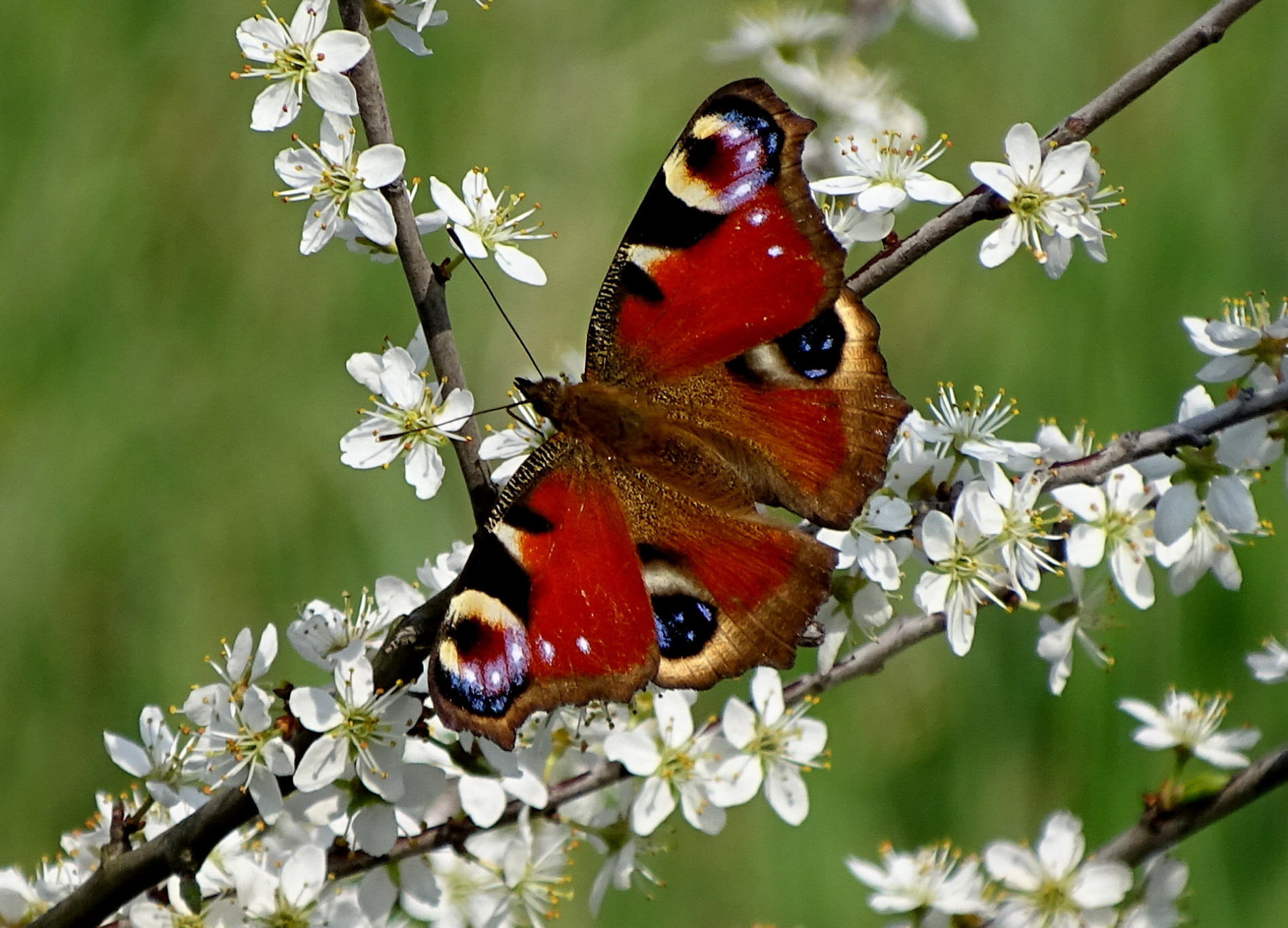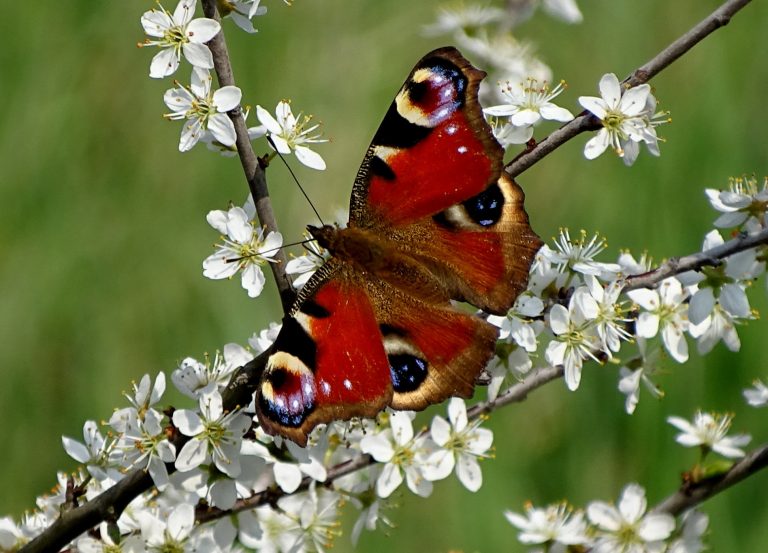 Wanneer je een kind vraagt welke vlinder hij of zij kent, is het antwoord steevast: Dagpauwoog. Deze vlinder is ook een van de allermooisten van de dagvlinders. De grote ogen zijn aansprekend en wij genieten er van. De functie van die ogen is eigenlijk heel anders. Wanneer een Dagpauwoog de vleugels gesloten houdt, is het een heel donkere, bijna zwarte vlinder. Wanneer hij plotseling de vleugels wijd open zet, kijken ineens grote ogen je aan. Veel vijanden schrikken daarvan en in de fractie tijd die dat oplevert, heeft de Dagpauwoog kans om te ontsnappen. Ook andere vlindersoorten hebben 1 of meer ogen op de vleugels. Ook dat is bedoeld om de vijand in verwarring te brengen: Wat is nu je kop en wat is je kont? Veel vlinders zijn aan vijanden ontsnapt omdat een predator ze aan de verkeerde kant vastgreep en zo alleen maar een hap vleugel in de bek of de snavel hield. De vlinder kan met een hapje er uit wel verder. De Dagpauwoog leeft in een paar generaties per jaar. Ze leggen eitjes op de brandnetel en de rupsen malen niet om de brandharen. Ze smullen van het blad en groeien als brandnetel. Het zijn zwarte rupsen met uitsteeksels aan alle kanten. Eenmaal volgroeid zoeken ze hun eigen weg en een verstopplekje om zich te verpoppen. Na verloop komt daar weer een nieuwe generatie uit. Die gedaanteverwisseling is een onbegrijpelijk wonder. De eerste generaties vlinders die uit de pop komen, leven een week of 6…… als ze geluk hebben. De laatste generatie die in het najaar uit de pop komt, leeft veel langer: De Dagpauwogen zoeken een plek om de winter door te brengen. Soms in bosje of een houtstapel. Vaak ook een schuurtje of een zolder. Om bestand te zijn tegen kou, maken ze van hun lichaamsvloeistof een soort antivries. Ze kunnen dan weinig meeer bewegen, maar wel temperaturen ver onder nul overleven. In het voorjaar bij temperaturen boven de 12 graden wordt de antivries weer gewoon lichaamsvloeistof en gaat de Dagpauwoog weer op stap. Eerst brandstof zoeken in de bloemen en dan een partner zoeken en paren. Daarna zoeken de vrouwtjes weer de brandnetels op om eitjes te leggen. De cyclus is rond. Het is tragisch, dat het met de dagvlinders en ook met de Dgpauwoog niet goed gaat. Gif, nectartekort, ammoniakovermaat, klimaatveranderingen; allemaal oorzaken van afname van de dagvlinders. Help de dagvlinders: zorg voor (liefst wilde) bloemen in de tuin het hele jaar, spaar een plekje met brandnetels, gebruik geen gif in je tuin. Met z’n allen kunnen we wat betekenen voor de Dagpauwoog.