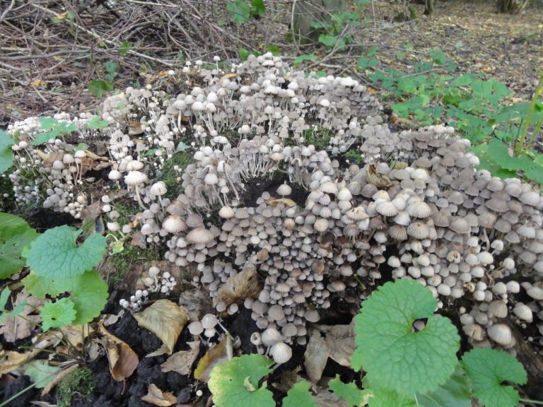 Als mensen last hebben van een boom kappen ze die. Meestal wil men dan ook de stronk verwijderen. Met een gewone schep en bijl of handzaag is dat een rotklus. Toen onze berk, een tijd geleden, gevallen was had ik geen zin in die klus en liet de stronk waar die was; naast de carport. Tegenwoordig heeft een klein paddenstoeltje zich over de stronk ontfermd. Met honderdtallen bevolken ze na een fikse regenbui het wilde minituintje rond de stronk; ja zelfs ook tussen de straatstenen onder de auto. Het zijn kleine grijze dingetjes met de hoedjes stijf tegen elkaar. Na een dag worden ze al zwart als inkt en dan zie je ze niet meer. Als ze wel langer vers blijven kan het een franjehoed zijn. Honderden tere, zachte eendagswezentjes zijn het die eventjes tweehonderd kilo houtresten opruimen. Het is een sterk verhaal, maar wist u dat de hele wereld zonder schimmels en zwammen bedolven zou raken onder een vijf meter dikke laag afval? Dat doet dus een stille kracht in een legioen van duizenden soorten en miljarden exemplaren; ongezien, niet opgemerkt, stilletjes onder strooisel en bladeren. Het zwerminktzwammetje komt overal in Nederland voor maar het meest in voedselrijke biotopen en op zacht, rot, loofhout. Tuinen en parken zijn in Drenthe favoriet.