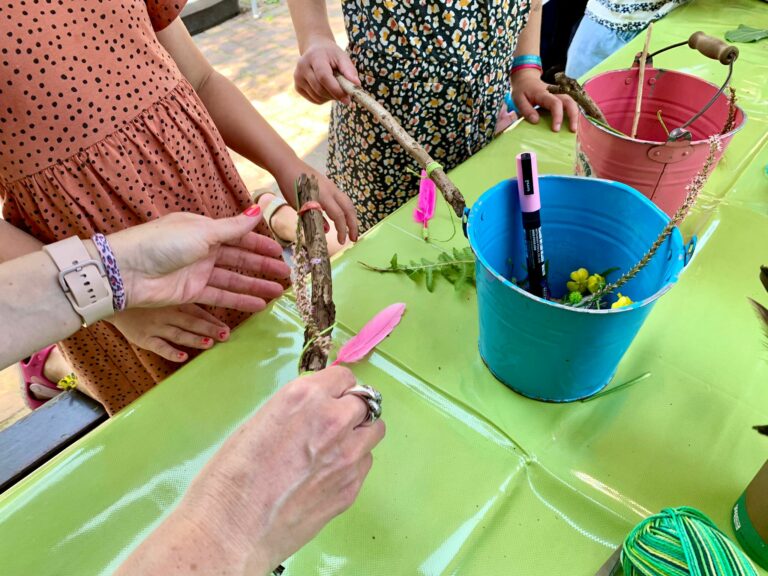 Heks Ellen vertelde verhalen over geneeskrachtige planten en liet iedereen ruiken, voelen en zelfs proeven. Met heks Renate zochten kinderen hun eigen tak en andere natuurschatten zoals steentjes, veertjes, eikeltjes en nog veel meer.