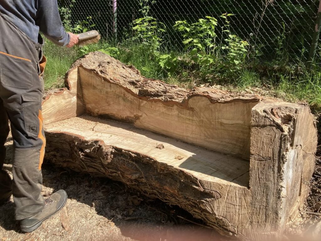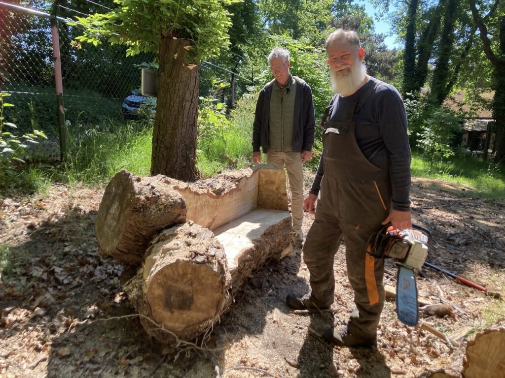 Benodigdheden: een flinke boomstam, een idee, een goede zaag, sterke mannen en zweetdruppels.