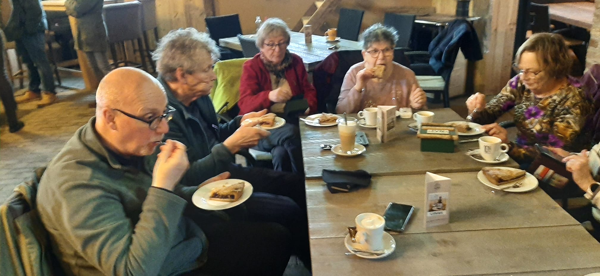 Na de wandeling hebben we in het café van Hoeve Blankenberg lekker genoten van verse vlaai met sjwatte proeme, kieësje of abrikoeëze.