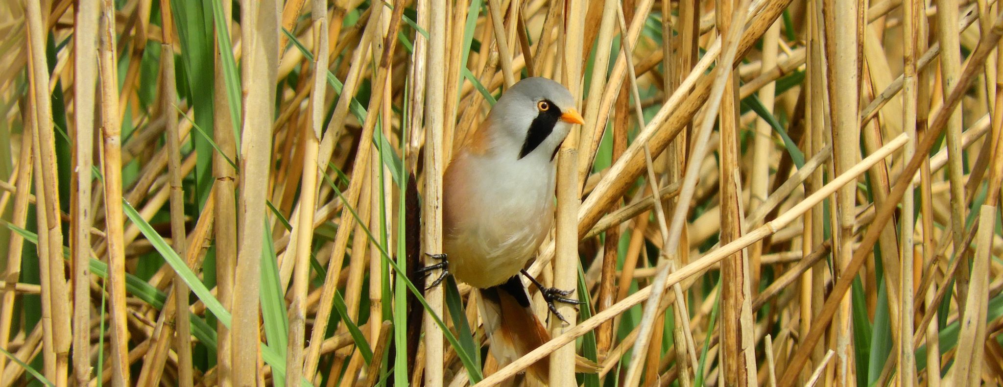 Dan hoor ik ineens een ander voorzichtig geluid uit het riet komen. ‘Ping, ping’. Een baardmannetje. Ik zie ‘m niet zo snel, maar vanuit mijn ooghoek zie ik wel een klein vogeltje landen in een dicht wilgenbosje. Het kost me moeite om het beestje terug te vinden tussen de vele takken. Als ik ‘m spot, maakt mijn hart een sprongetje. Gaaf, het is een kleine bonte specht. Elke keer verbaas ik me erover hoe klein ie is. Ik laat de baardman even lopen en probeer dit kleine beweeglijke spechtje vast te leggen. Moeilijk scherpstellen tussen al die priegeltakjes. Hij vliegt een paar keer door naar een volgend wilgenbosje en ik schiet op goed geluk maar raak. Nou eerst maar weer een stukje doorwandelen om warm te worden. Ondanks het zonnetje is het toch nog fris als je stil staat. Als er een paar zwanen overvliegen laat de trompetzwaan van zich horen. Een wonderlijk geluid. Dit beest is een aantal jaar geleden uit Aquazoo ontsnapt en zwemt hier nog altijd in de rietvelden rond. Ha, daar hoor ik weer een baardmannetje. Na een tijdje wachten, zie ik ‘m omhoogklimmen naar de rietpluimen. Wat zijn ze toch enorm fotogeniek.