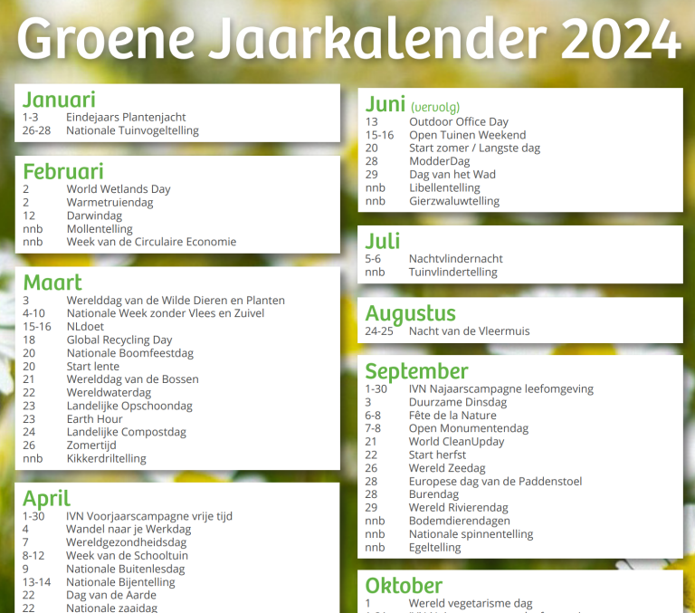 Deze kalender kun je gebruiken om aan te haken op (inter)nationale dagen of periodes die in het teken staan van natuur en duurzaamheid. De dagen zijn ook terug te vinden in de agenda op Ons IVN en worden regelmatig meegenomen in de agenda van de Stuifmail (maandelijkse nieuwsbrief voor actieve leden en bestuursleden).