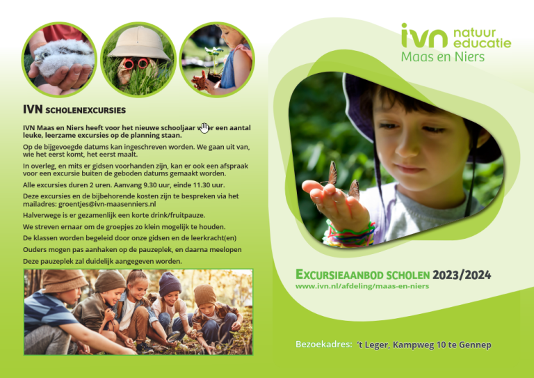 IVN Maas en Niers biedt voor het nieuwe schooljaar een aantal leerzame en leuke excursies voor lagere scholen aan. Lees het excursieaanbod en de data hieronder in de folder of download deze hier.
