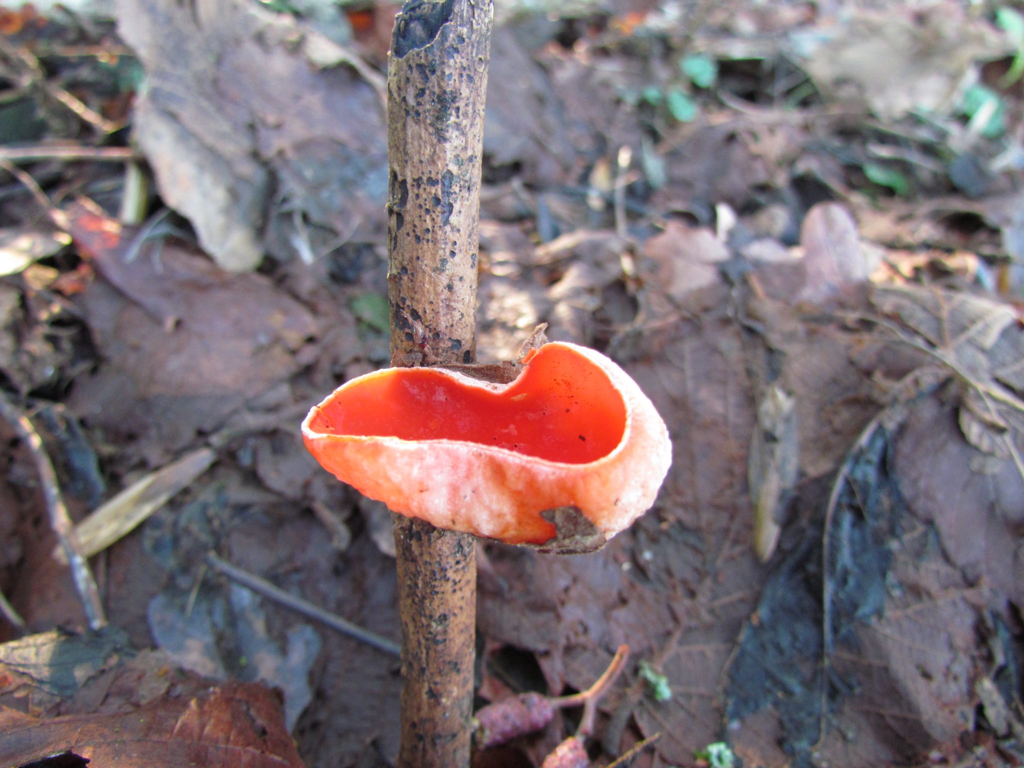 Tijdens de wandeling door het met kwelwater doorweekte Roodslagbos in Beuningen heeft gids Theo toch nog een bijzondere ontdekking gedaan. Eerst dacht hij een stuk mandarijnenschil te zien, maar nee, het was een paddenstoel, de rode kelkzwam.