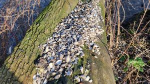 Tijdens een rondwandeling over het Hanzeland in Maasbommel vonden onze natuurgidsen een grote opeenhoping van allerlei soorten schelpen langs de waterkant. Het is de smidse van meerkoeten (of andere watervogels?) die op deze plaats de schelpen breken om het vlees te eten.