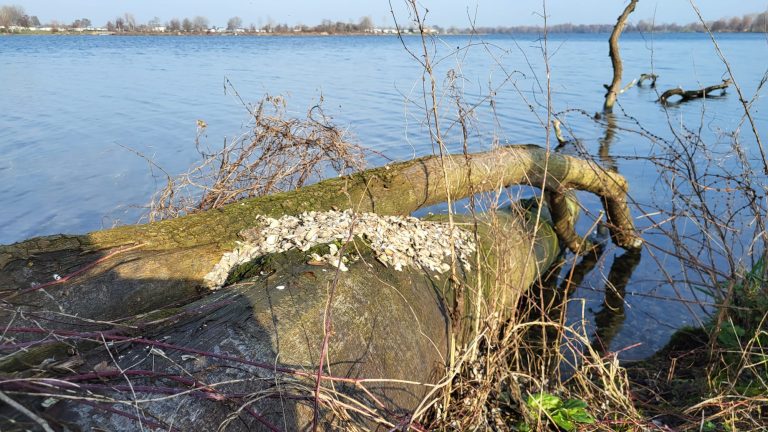 Tijdens een rondwandeling over het Hanzeland in Maasbommel vonden onze natuurgidsen een grote opeenhoping van allerlei soorten schelpen langs de waterkant. Het is de smidse van meerkoeten (of andere watervogels?) die op deze plaats de schelpen breken om het vlees te eten.