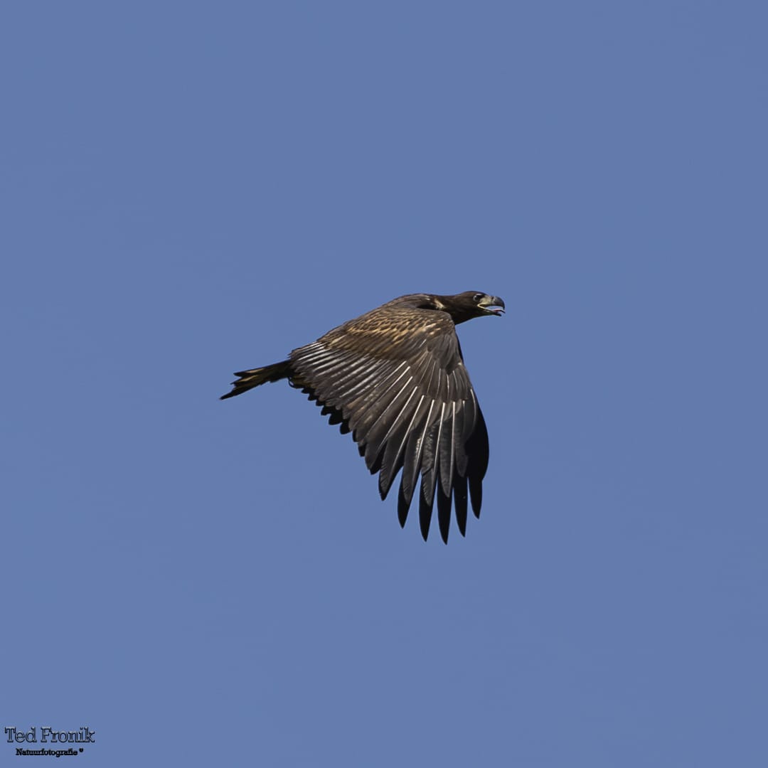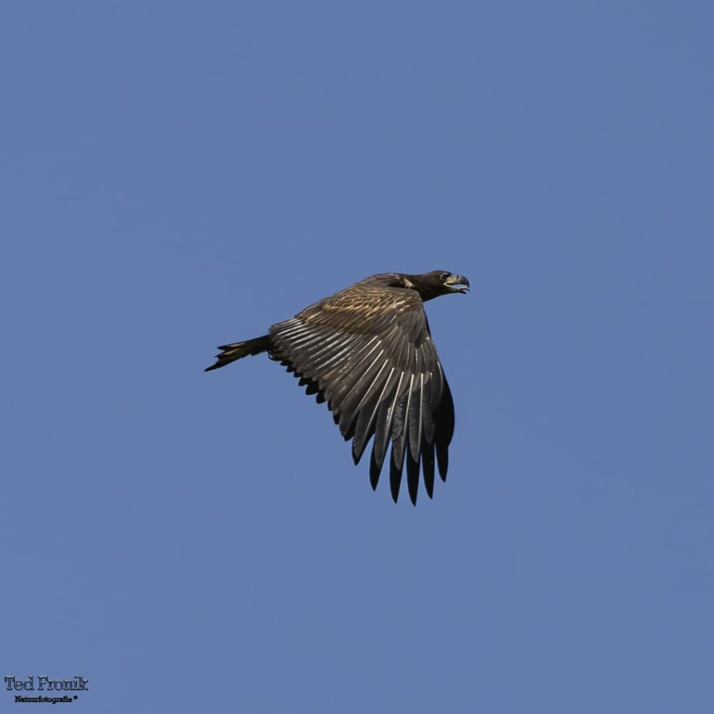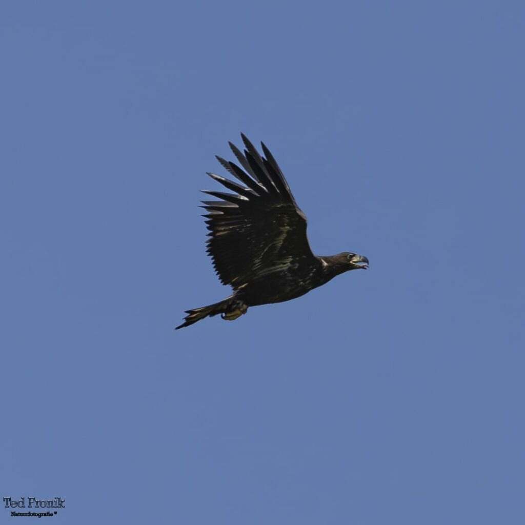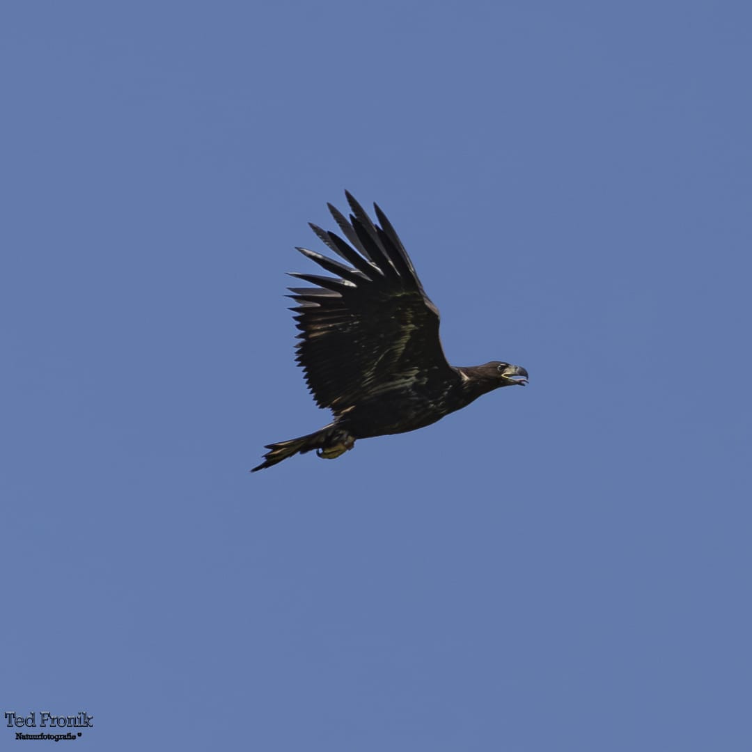 Fietsend over de dijk ter hoogte van de Leeuwense Waard werd natuurfotograaf Ted Fronik op afstand begeleid door deze zeearend. Altijd weer indrukwekkend om deze grote vogels te zien vliegen met hun brede gevederde vleugels en wigvormige staart.