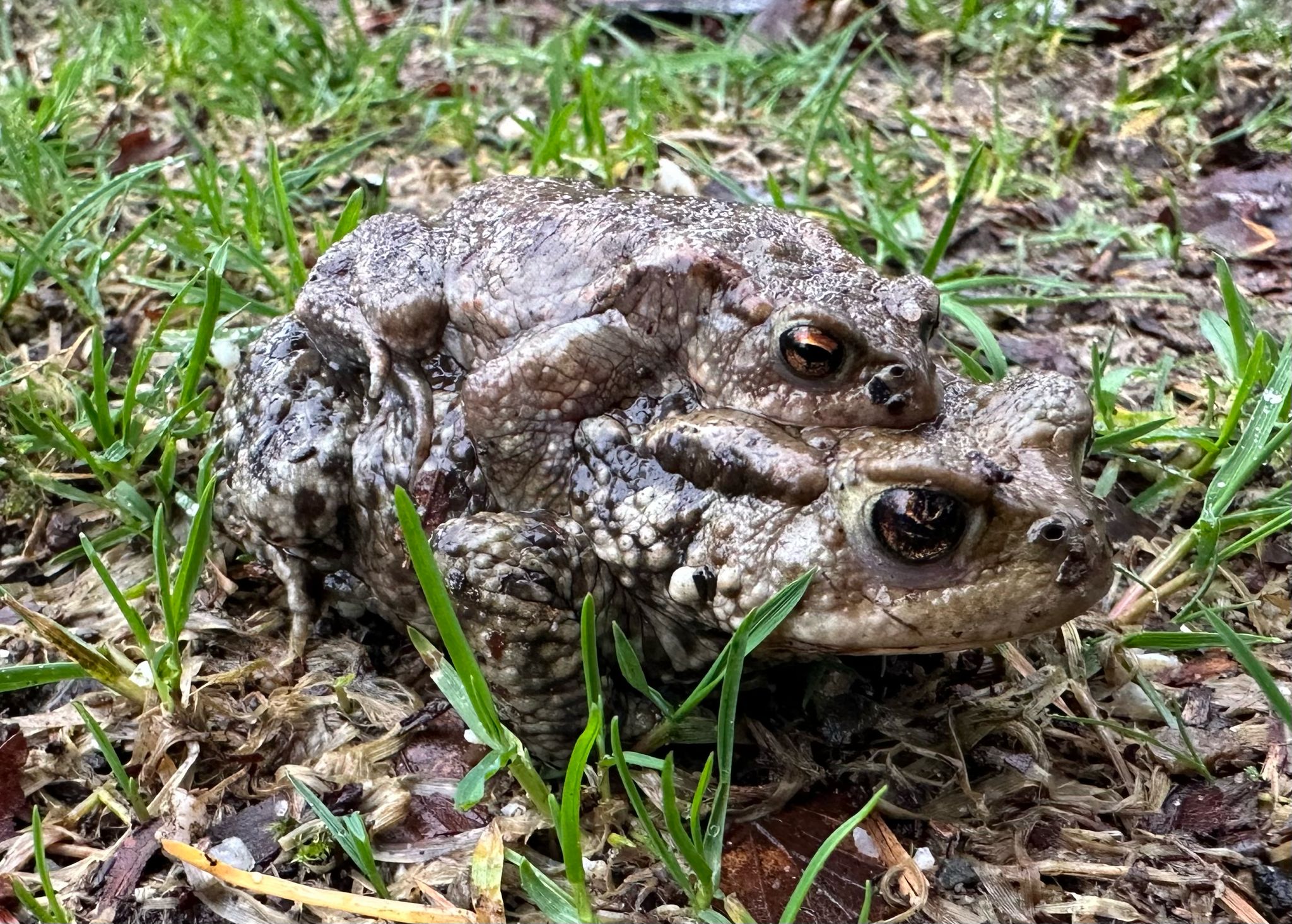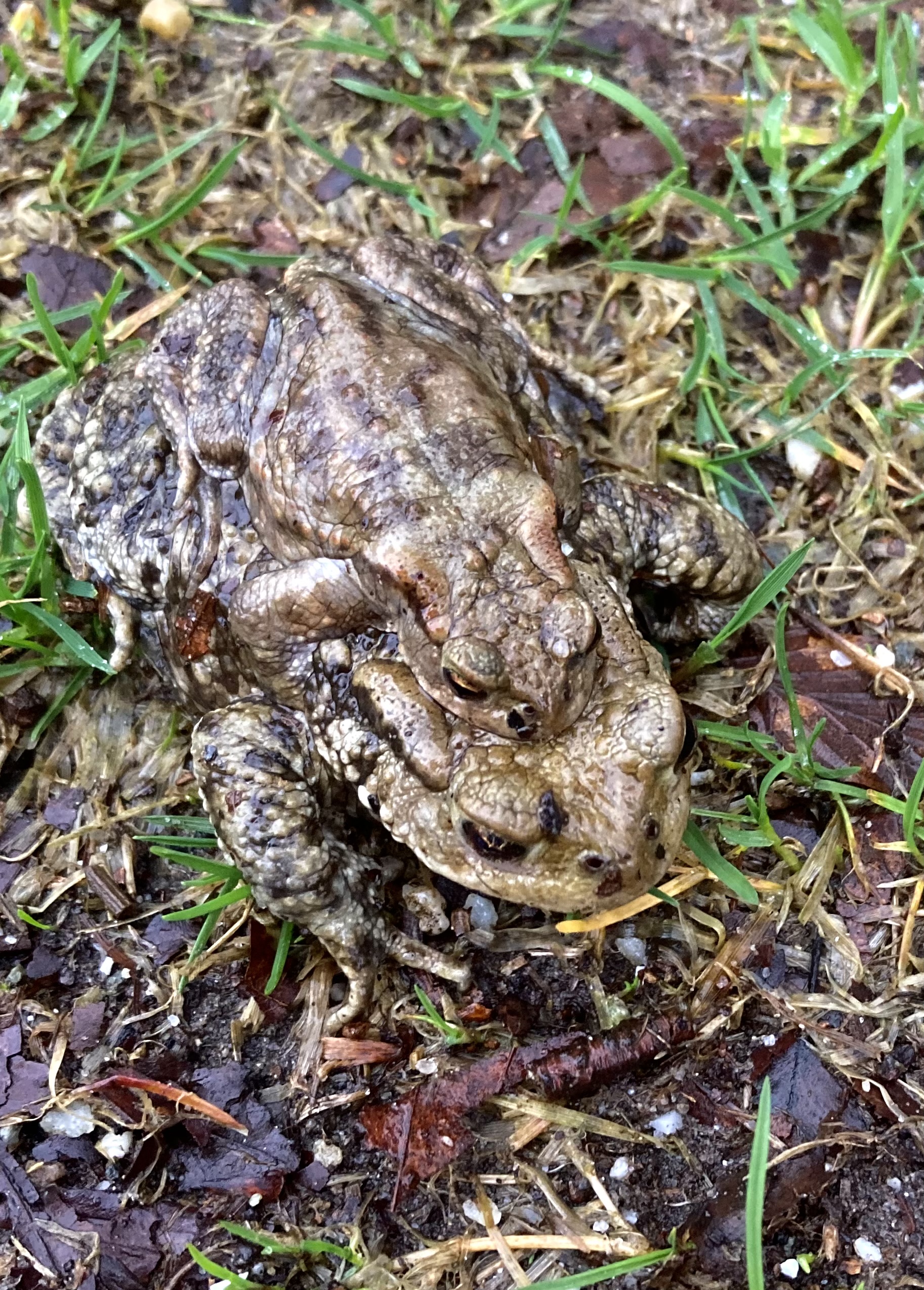 Marion Kroezen zag dit paddenpaar in de zogenaamde amplex houding. De mannetjes klemmen zich vast aan een vrouwtje en laten zich door haar naar een poel dragen om te paaien. Het is goed te zien dat de mannetjes veel kleiner zijn dan de vrouwtjes. Haar buik zit al vol met eieren die straks bevrucht worden. Als je de tocht heelhuids kunnen voltooien.