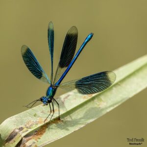 Tijdens een zwerftocht door de Maas en Waalse natuur heeft natuurfotograaf Ted Fronik bij een sloot in Beneden Leeuwen deze schoonheid ontdekt: de weidebeekjuffer. De wetenschappelijke naam Calopterygidae spendens betekent mooie vleugel prachtig. De metallic blauwe kleur geeft aan dat het een mannetje is. Op de poten en het lichaam zijn de fijne haren goed te zien. Sloten met stromend water en steile oevers met hoge kruidenvegetatie vormen de ideale habitat voor deze libel. De larven leven onder de waterplanten in donker, zuurstofrijk water. Maaibeleid en slootbeheer beïnvloeden dus sterk het voorkomen van de weidejuffers. |