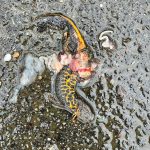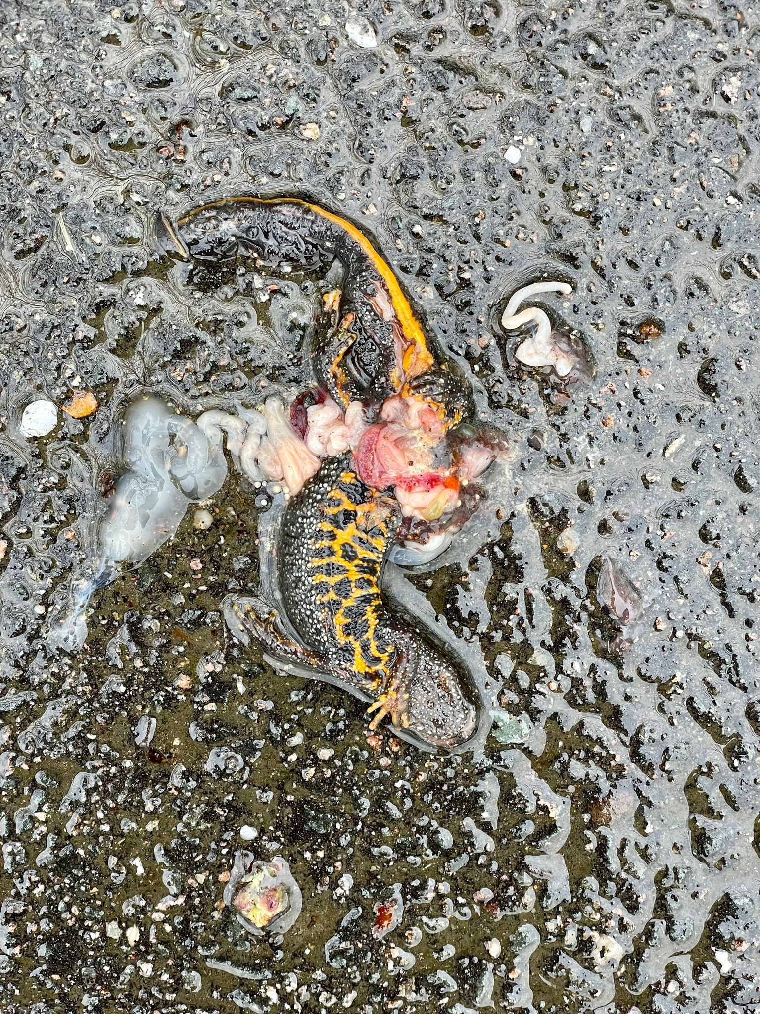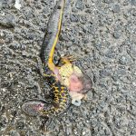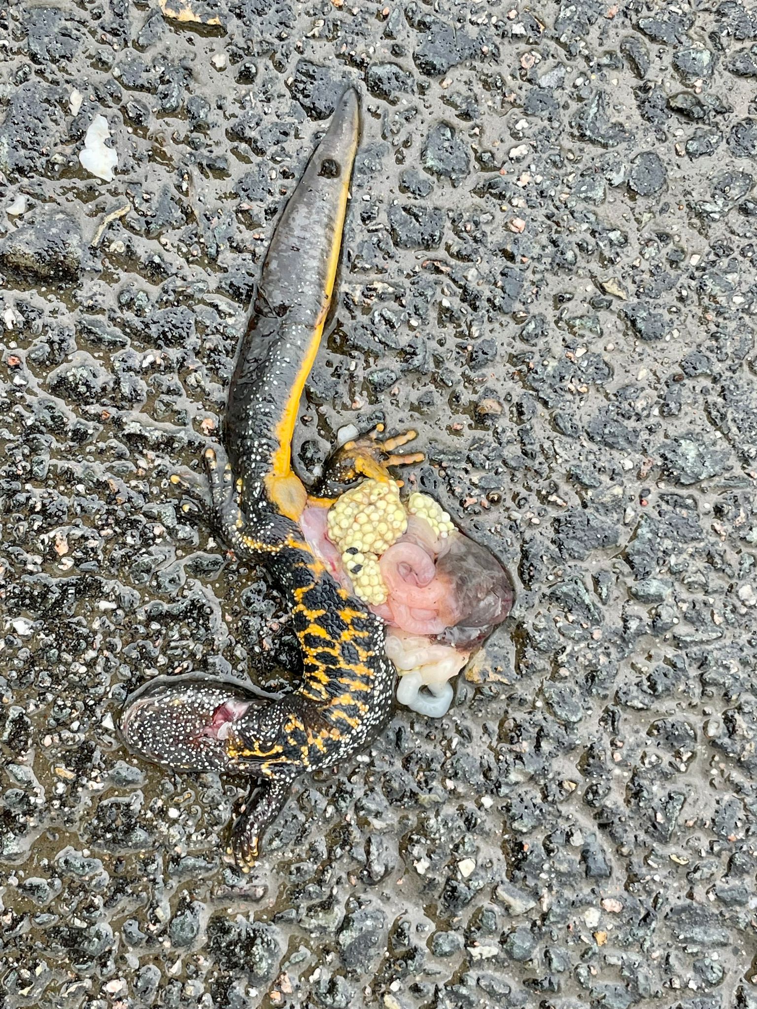 Michelle Peeters maakte deze foto’s van overreden kamsalamanders op de Kerkstraat in Wamel. Het blijkt dat in deze omgeving veel van deze salamanders leven die nu naar hun voortplantingswater aan de overkant van de weg trekken. De eitjes van deze kamsalamander zullen het voorplantingswater helaas niet meer bereiken om bevrucht te worden. Om nog meer slachtoffers te voorkomen hebben vrijwilligers van IVN Maas en Waal tijdelijke schermen aan de wegrand geplaatst waardoor de amfibieën in emmers verzameld worden om veilig aan de andere kant weer los te laten. Kamsalamanders staan op de rode lijst als kwetsbaar en moeten beschermd worden.