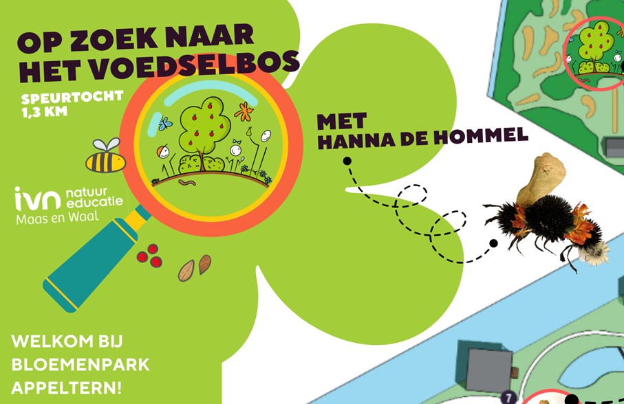 In Bloemenpark Appeltern is dit voorjaar de aftrap gedaan voor de aanleg van een inspiratie Voedselbosje inclusief educatieve speurtocht. Bloemenpark Appeltern en IVN Gelderland hebben de handen ineen geslagen om in het najaar het Voedselbosje te realiseren. IVN Maas & Waal heeft geholpen bij de ontwikkeling en verdere uitwerking van de ideeën. Zo ontstond een creatieve speurtocht aan de hand van een verhaal over Hanna de Hommel die op zoek is naar voedsel. De kinderen helpen Hanna de weg naar het Voedselbos te vinden. Daar aangekomen is er een educatief spelelement met een zintuigen rad. Alle zintuigen worden geprikkeld. Het wordt een plek waar je kan genieten van eetbare vaste planten. Het Voedselbosje wordt opgebouwd uit verschillende lagen van bomen, struiken, kruiden, klimplanten en bodembedekkers.