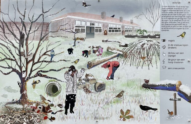 Deze basisschool in Afferden heeft een landelijke primeur: zij is de eerste school in Nederland met een IVN Seizoensbord op hun nieuw, groene schoolplein! Dit prachtige bord toont een wintertafereel en laat zien welke dieren en planten je in dit seizoen kunt ontdekken.