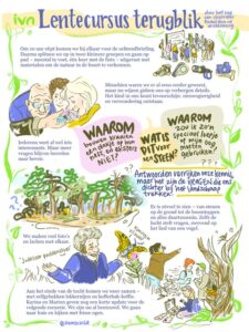 Dit voorjaar vond weer de basiscursus Lente in Maas en Waal plaats, een programma dat vooral gericht is op beleven, zelf kijken, onderzoeken en leren. Samen met onze gidsen gingen de deelnemers op stap om meer te leren over de natuur in onze omgeving. Met als doel om beter thuis te raken in de ons omringende natuur, want daar valt zo veel meer te zien en te beleven dan je denkt! Een van de deelnemers, Rachel Hom-Van den Wildenberg, is schrijver en illustrator. Haar belevenis zette zij om in een prachtige illustratie die we graag delen (klik op de afbeelding voor groter beeld):
