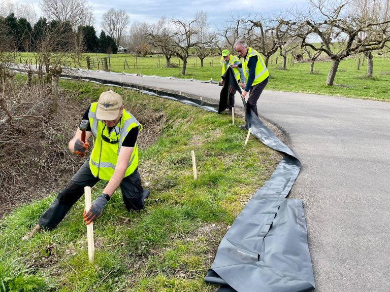 Op de Kerkstraat in Wamel vonden onze paddentrek vrijwilligers veel overreden kamsalamanders. Deze soort is kwetsbaar en moet beschermd worden. Daarom heeft de werkgroep ijlings een actie opgezet om deze locatie veiliger te maken tijdens de trek. Er was nog materiaal beschikbaar dat ook op de Waalbandijk werd gebruikt. Na overleg met de gemeente WMW en aanwonenden hebben enkele vrijwilligers schermen geplaatst en emmers ingegraven. Elke morgen worden de verzamelde amfibieën naar de overkant gebracht. Benieuwd naar de resultaten van de amfibieën werkgroep? Kijk op padden.nu voor de aantallen overgezette soorten op de verschillende trajecten in Maas en Waal.
