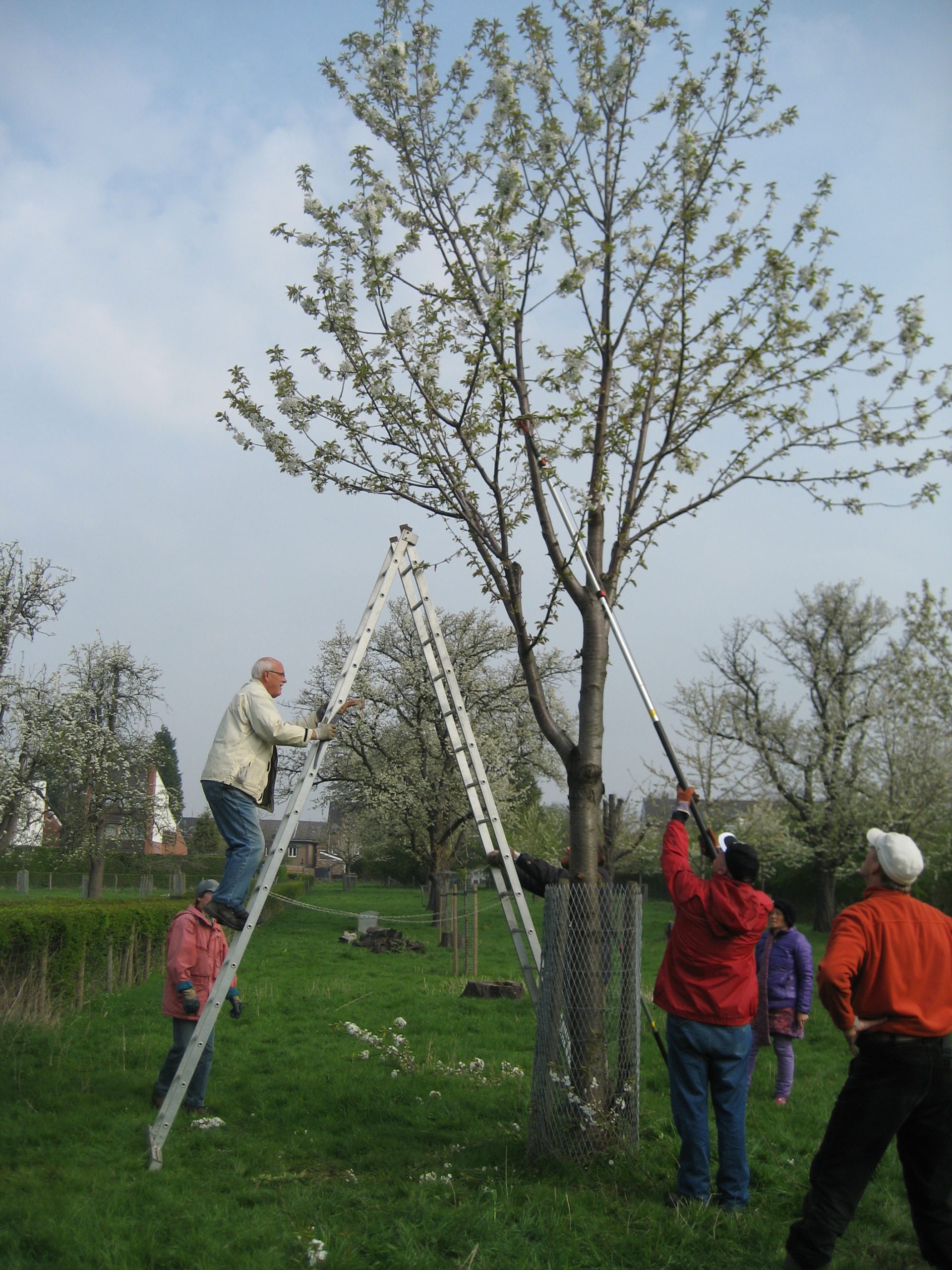 In een ontspannen sfeer samen met buurtbewoners aan de slag om zodoende kennis en kunde over het snoeien van deze hoogstamfruitbomen over te dragen.