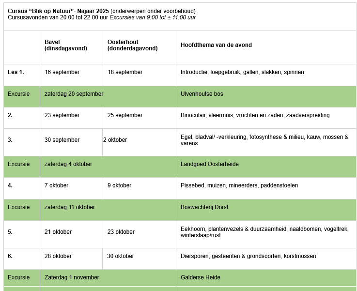 De cursus omvat 6 lesavonden en 4 excursies op de zaterdagochtend.
