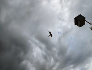 Het waakzame vrouwtje blijft in de buurt, kris kras vliegend door de lucht of zittend op een paal met een prooi in de snavel.