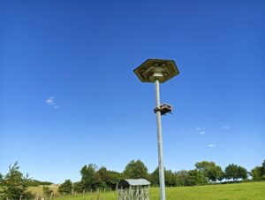 De huiszwaluwtil met halverwege de paal de gemonteerde lokgeluidenkast.