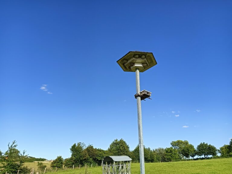De huiszwaluwtil met halverwege de paal de gemonteerde lokgeluidenkast.