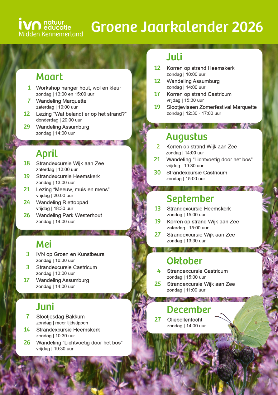 Onze Groene Jaarkalender staat bol met allerlei soorten activiteiten voor het komende jaar. Afhankelijk van de interesse, het weer, de beschikbaarheid van gidsen en de gesteldheid van de flora en fauna kunnen er activiteiten bijkomen, afvallen of wijzigen in aanvangstijd. Hou de activiteitenpagina op de website dus in de gaten.
