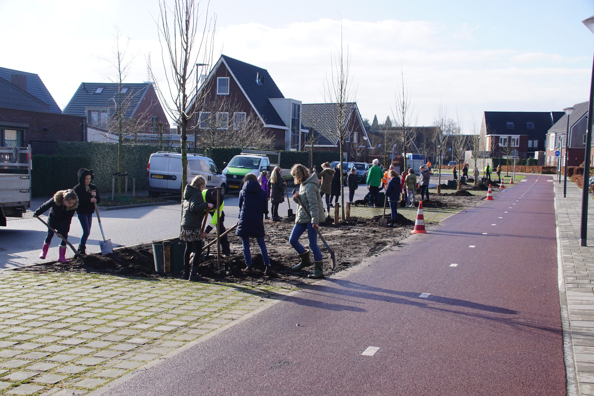 Op een zonnige woensdagochtend waren 30+ kinderen van ‘t Schrijverke onder begeleiding naar de Vlinderlaan getogen. Enkele mensen van de Gemeentelijke groenvoorziening en een aantal schoolgidsen van IVN Mierlo waren al ter plaatse. De Gemeente had de dag ervoor de nodige voorbereidingen getroffen door een 16-tal plantgaten te graven en hierin de redelijke grote Linde’s en Iepen te zetten. Na een opening van wethouder vd Laar konden de kinderen aan de slag en konden de plantgaten met zand gevuld worden. De natuurgidsen en mensen van de gemeente vertelden ondertussen wat over de bomen en hoe deze te onderhouden en beantwoordde de vragen van de enthousiaste kinderen. Na 1,5 uur was de klus wel geklaard en ging iedereen tevreden terug naar school of huis. Met recht weer een mooie boomfeestdag en een traditie om in ere te houden gezien het enthousiasme van de kinderen en begeleiders.