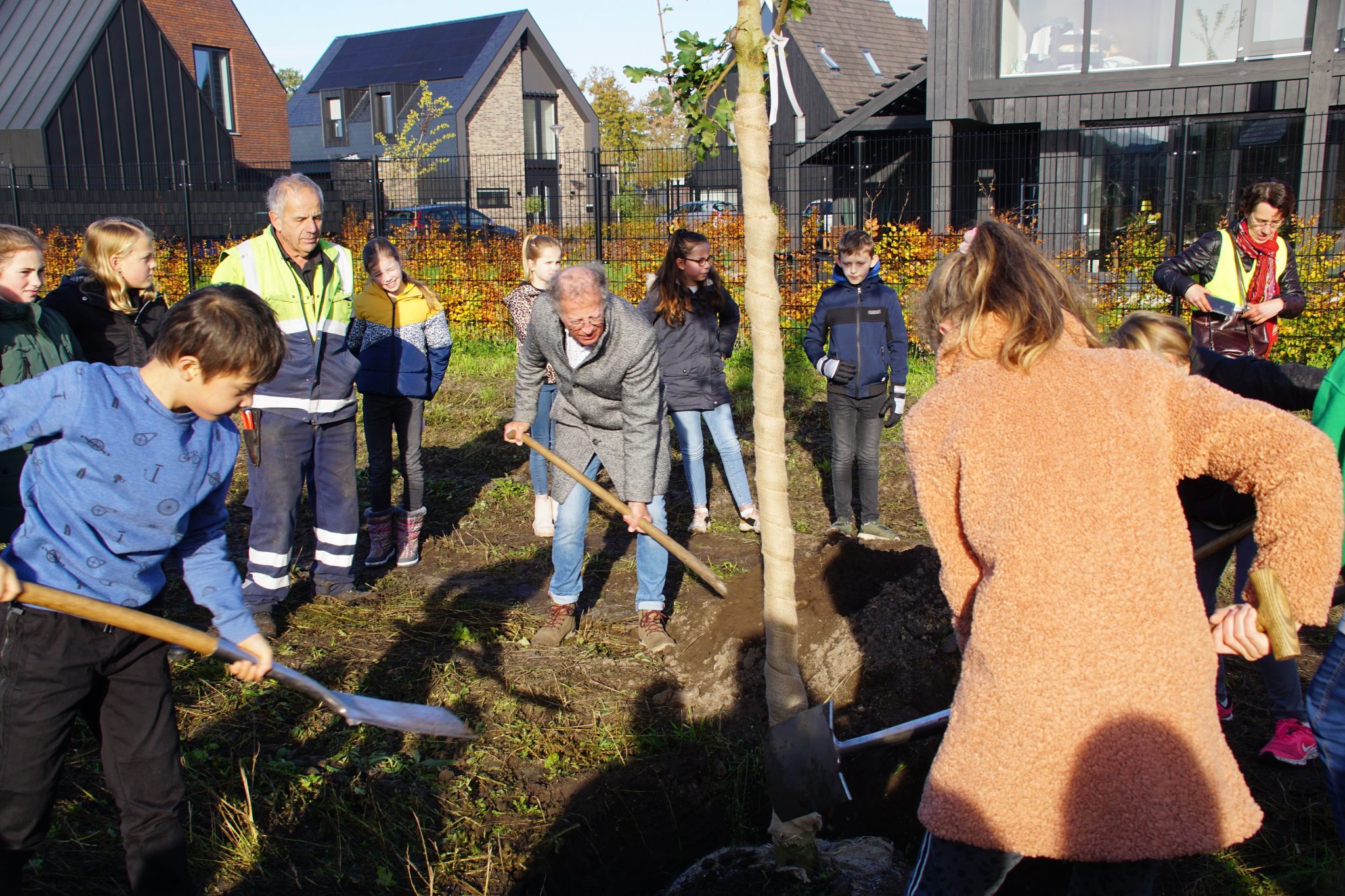 Groep 7 van ‘t Schrijverke Luchen gaat aan de Vlinderlaan lindebomen en iepen planten.