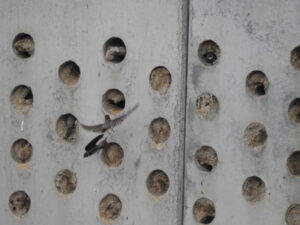 De oeverzwaluwen zijn met verrekijker goed te zien vanaf het fietspad bij de sportvelden. Een aanrader.