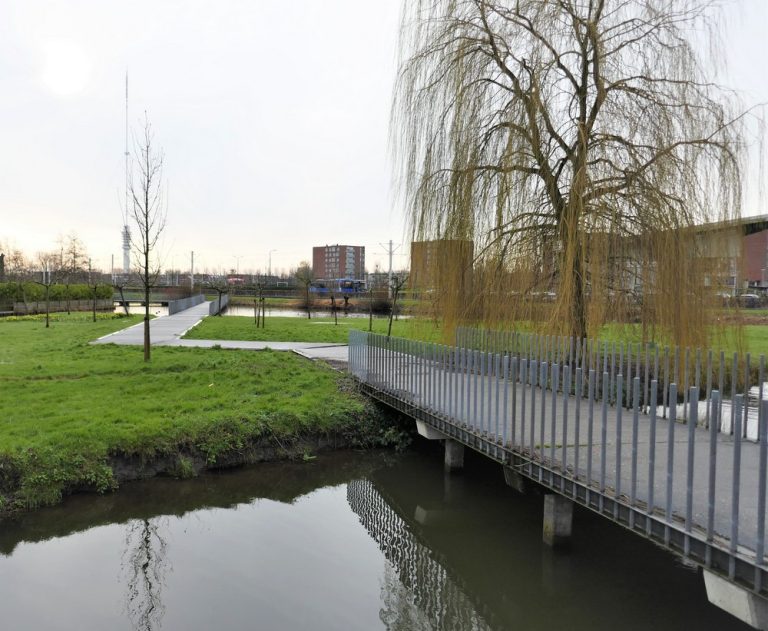 Park met een brug, water, grasveld en kale treurwilg; gebouwen en een tram in de achtergrond.