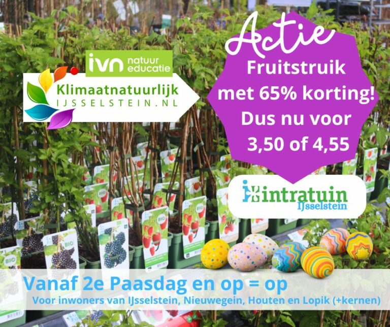 Vanaf 1 april 2024 kun je bij Intratuin IJsselstein een fruitstruik kopen met een flinke korting van 65%. Je betaalt dus zelf maar 35% van de totaalprijs!