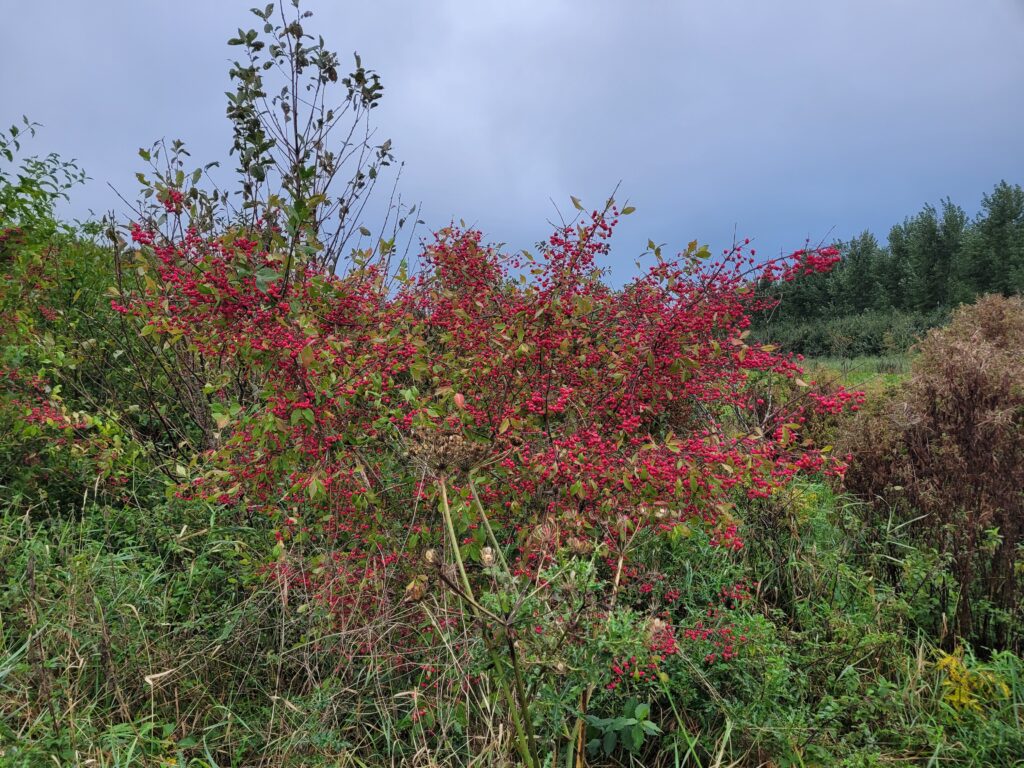 Dit is een afwisselende en heerlijke wandeling. In aangenaam gezelschap (14 sportievelingen), beginnend op de Zomerdijk, hier en daar wat te zompig (jaagpad langs de IJssel), zodat de route even wordt aangepast. We lopen over vochtige klei, tussen ritselende populieren. Onze ogen laten we gaan naar de rijpende kleurige bessen aan de struiken (Gelderse roos, meidoorn, kardinaalsmuts, sleedoorn, lijsterbes). Aan de randen van het bos is er uitzicht over de weilanden, waar enkele ganzen aan het grazen zijn. Er vliegen nog wat libellen rond. Een buizerd laat zich horen. Het ruikt al naar de herfst. Paddenstoelen laten hun hoeden al zien. Er waait een lekker windje. Kortom: een aangename afwisselende natuurwandeling.