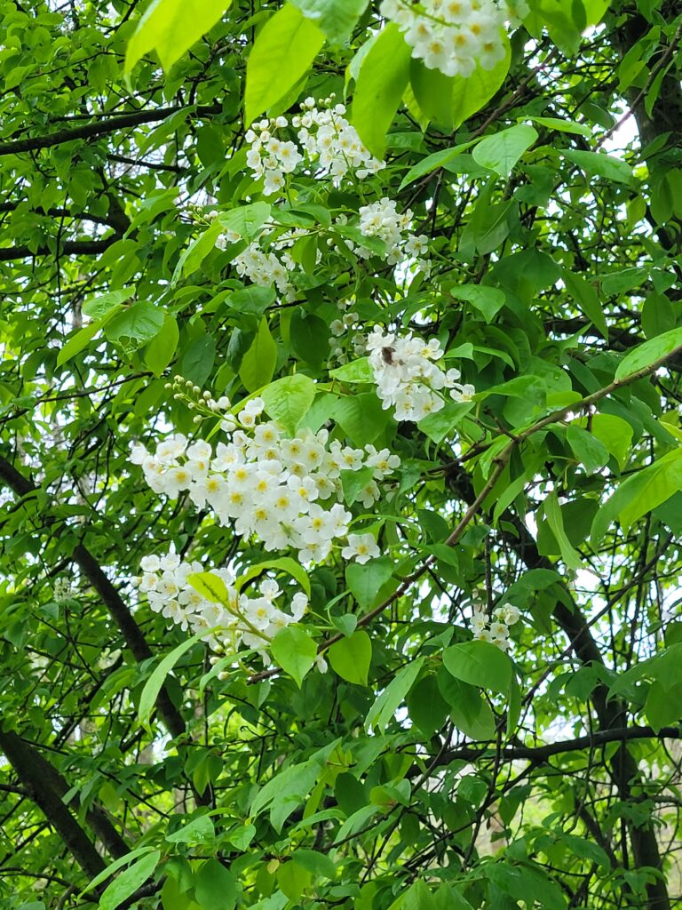 We zien veel bloeiende planten en horen voortdurend zingende vogels om ons heen. Bij het geluid van zanglijsters, tjiftjaf en de zwartkop, zien we fluitekruid, witte dovenetel, nog wat speenkruid en vogelkers in bloei.