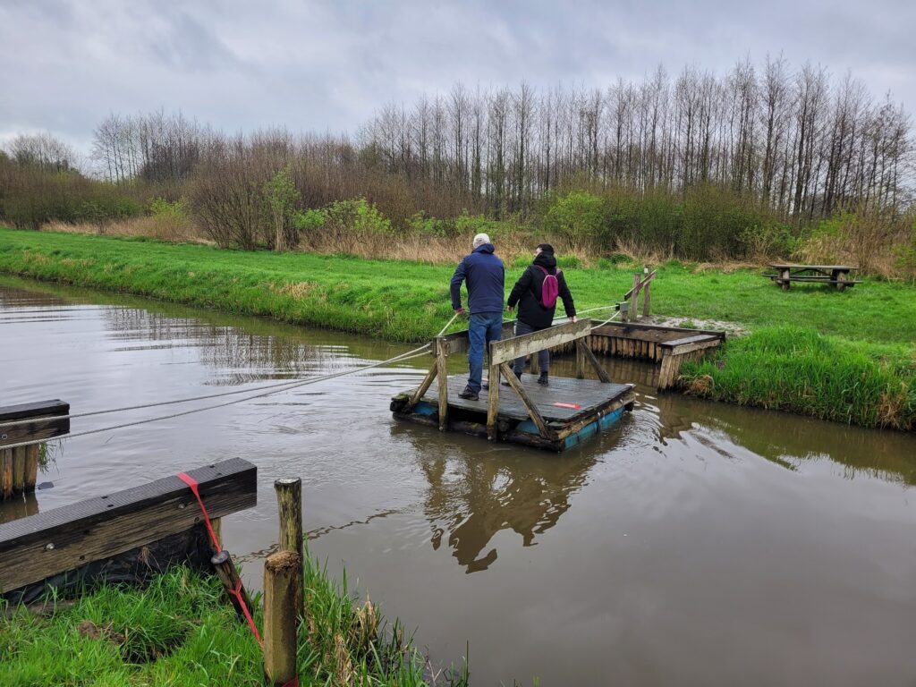 We lopen eerst een rondje door het bos van Nieuw Wulfen; hier en daar nogal modderig. Sommigen nemen een pontje, maar je kunt er ook omheen lopen.