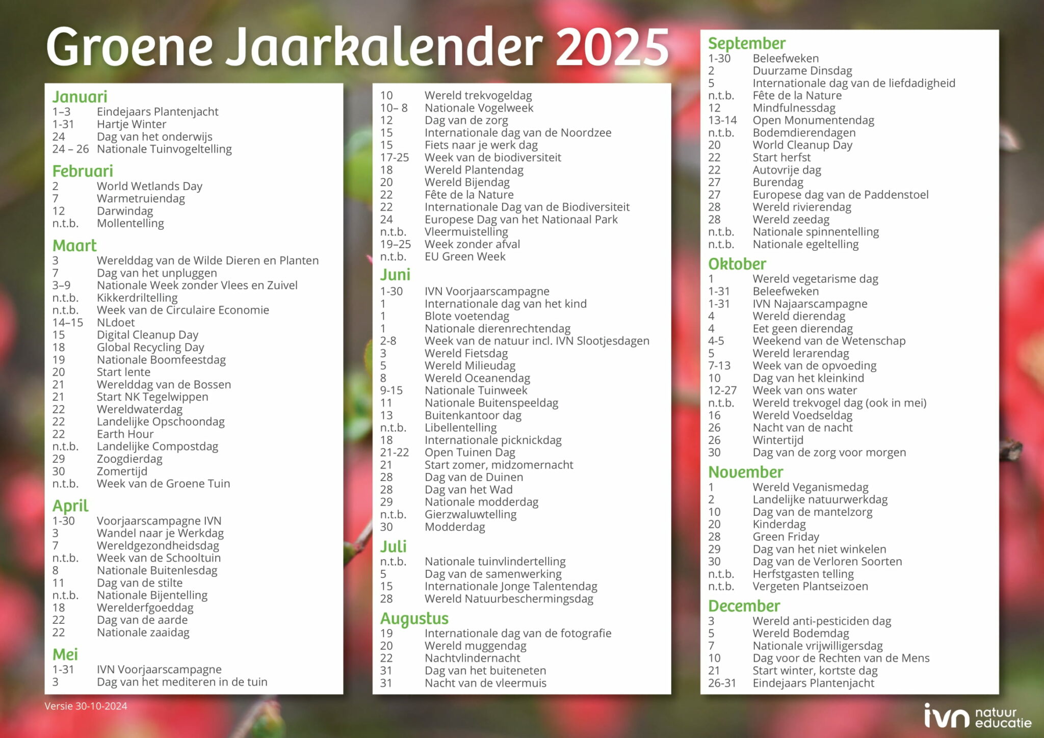 Met de Groene Jaarkalender ben je altijd op de hoogte van alle groene dagen in het jaar. Van de Outdoor office day tot de Nacht van de nacht: zo mis je nooit meer een speciale dag.