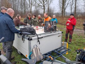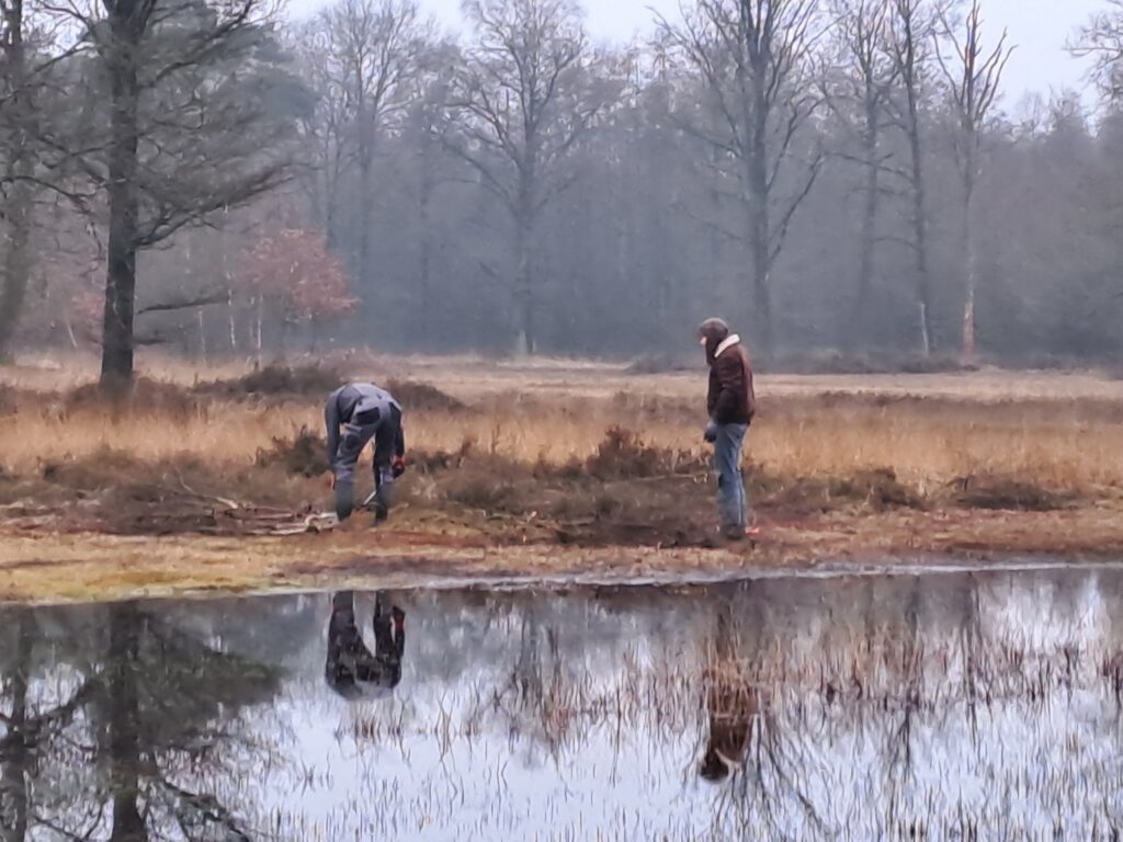 De ene groep ging verder met de werkzaamheden van de vorige keer: het verwijderen van alle dennen- en berkenopslag van de heide. andere groep ging op een andere locatie een slootkant schoonmaken: wilgen en bramen knippen en soms zagen en het materiaal in de ril leggen. Ook nu merk je weer dat na een kwartier werken je lichaam op temperatuur komt. Het hoogtepunt van de morgen is dan toch elke keer wel weer de koffie- en theepauze, wederom prima verzorgd door Lilly. Best een klus om dit voor bijna 20 man te verzorgen, maar het lukte om iedereen van een warme drank te voorzien. Er waren dit keer opnieuw werkers die voor de eerste keer meededen, maar het was goed om te zien dat ze bij de gesprekken betrokken werden en volop meededen. Welkom nieuwelingen! Om kwart over twaalf liepen we terug naar de kar en het is zo bevredigend om te zien hoeveel werk je met elkaar verricht hebt. De slootkant is over een lengte van wel 150 meter helemaal opgeschoond en op de heide is ontzettend veel opslag verwijderd, dat ligt in grote takkenbossen te wachten tot het verder verwerkt wordt. Na afloop het gereedschap even droogmaken, in de kar plaatsen en naar huis toe. Een heerlijke, gezellige morgen in een prachtig gebied!