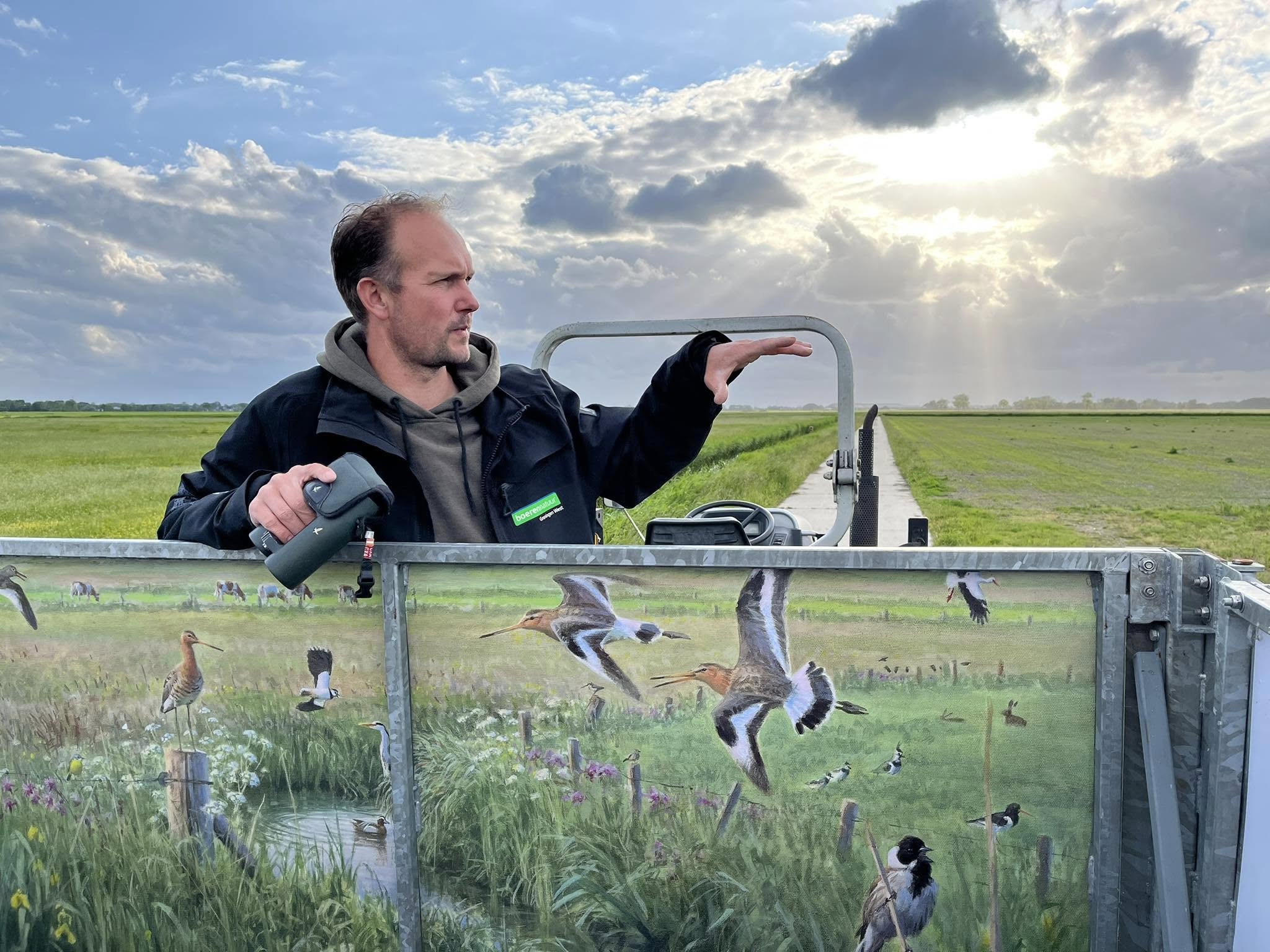 Helaas gaat het slecht met de weidevogels in Nederland. Maar daar is wel wat aan te doen. Met veel enthousiasme vertelt Anne-Jan Staal (foto onder) over de broedsuccessen van de weidevogels in het gebied Tinallinge. Daar staat Weidevogelboerderij Rodewolt, een melkveebedrijf waar landbouw en succesvol weidevogelbeheer samen gaan. Anne-Jan geeft o.a. advies bij deze boerderij over het weidevogelbeheer. Daarnaast verzorgt hij in mei en juni rondleidingen over het terrein met de weidevogelexpres; een tractor met een kar met zitplaatsen erachter.