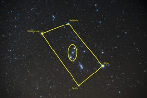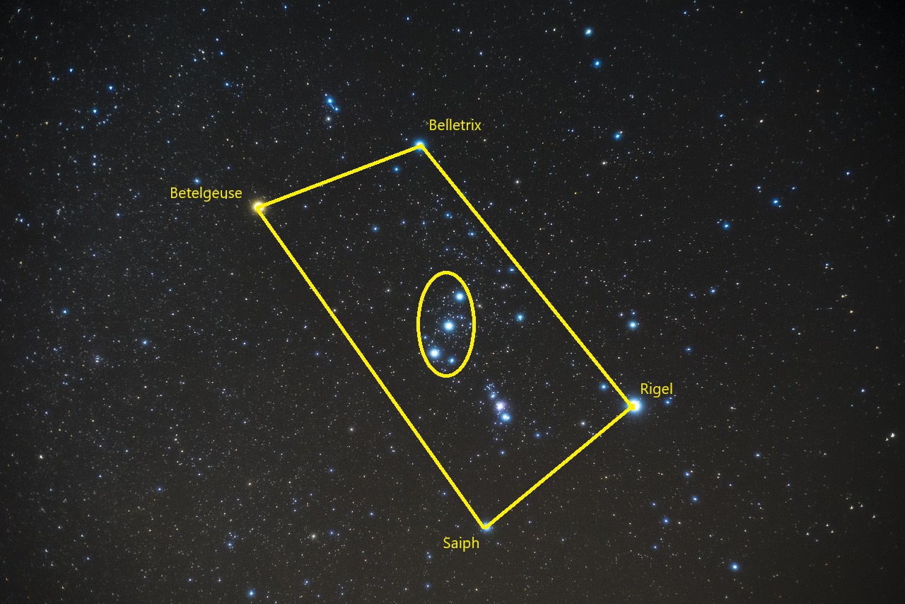 Orion staat in het zuiden. In het midden van Orion staan drie sterren als een denkbeeldige gordel (in de afbeelding de sterren in het gele ovaal), daarboven staan twee heldere en daaronder ook. Als je de twee onderste en bovenste heldere sterren met elkaar verbindt ontstaat er een denkbeeldige scheve rechthoek. De sterren die je binnen dit gebied kunt tellen, tellen mee met deze meetactie. De sterren op de vier hoeken, op de afbeelding met naam genoemd, tellen niet mee. Klik op de afbeelding om deze te vergroten.