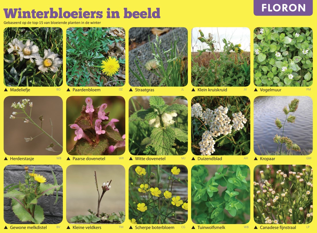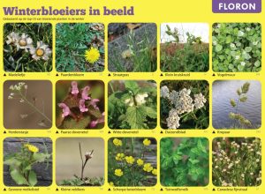 Midden in de winter zijn er verrassend veel bloeiende plantensoorten te vinden. Sommige kunnen het hele jaar door bloeien, andere weten hun najaarsbloei te rekken wanneer er geen serieuze nachtvorst is. En als het weer meezit dan komen de voorjaarsbloeiers al uit op zonnige en beschutte plekken. Mocht het tijdelijk heel koud zijn, waardoor er geen planten bloeien, kijk dan nog een keer als het minder koud is. Planten kunnen soms heel snel weer in bloei staan.