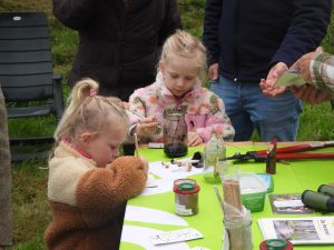 De andere tafel was meer een beleeftafel; er was een vissenkom waar kinderen stekelbaarsjes en waterplantjes van heel dichtbij konden bekijken. En Johanna had inkt mee, gemaakt van vergane inktzwammen, waar kinderen mee konden schrijven. Ook konden kinderen met loepjes paddenstoelen, die Arie Beemsterboer had geplukt, onderzoeken.