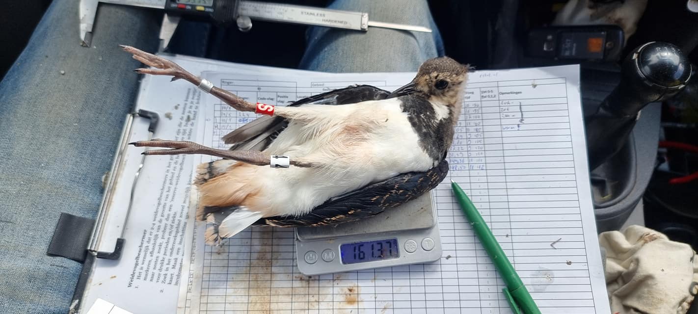 Foto onder: Jonge kievit wordt gewogen (van FB Weidevogelboerderij Rodewolt)