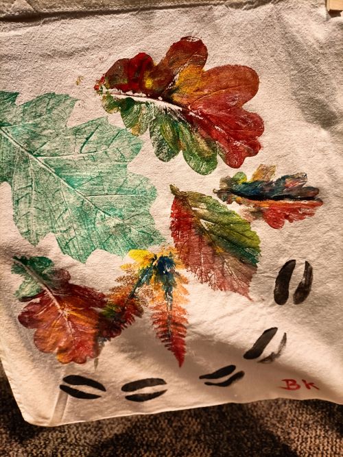 Vervolgens waren er verschillende workshops. Eén van die workshops werd gegeven door Lysbet Hoekstra van IVN Leeuwarden. Met buiten gevonden herfstbladeren etc, ingesmeerd met textiefverf, werd een linnen tas bedrukt. Er lagen ook stempels om de tas verder te versieren. In plaats van een tas kan je dit natuurlijk ook gewoon op papier doen. Een leuke activiteit geschikt voor verschillende doelgroepen.