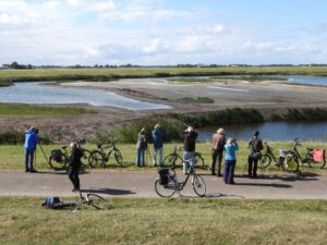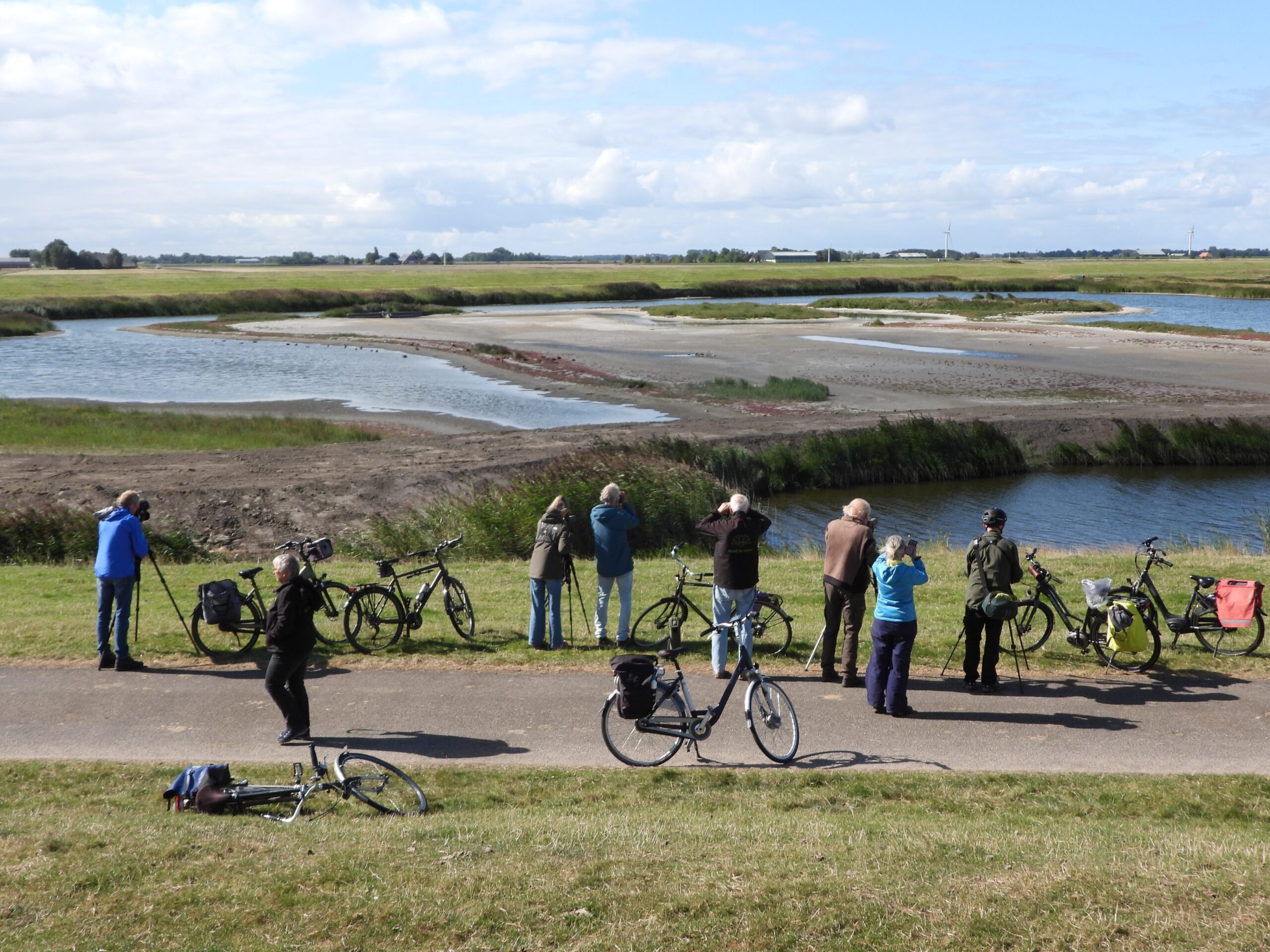 Daarna was het tijd voor de excursies. Menco Jan Alsema begeleidde een groep fietsers naar de Klutenplas waar ca. 25 soorten vogels werden gespot (foto onder). Er werd ook een blik buitendijks geworpen. Daar waren naast vogels, met name kokmeeuwen, ook een grote groep paarden te zien en een kudde koeien die de kwelder met hun begrazing kort houden.